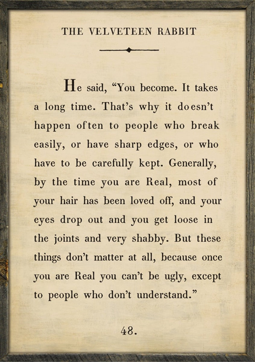 Velveteen Rabbit Art Print features a wonderful quote from the timeless book. Makes a wonderful child or baby's room home decor piece. Printed on wood and ready to hang in the weathered wood frame. By Southern artist, Rebecca Puig